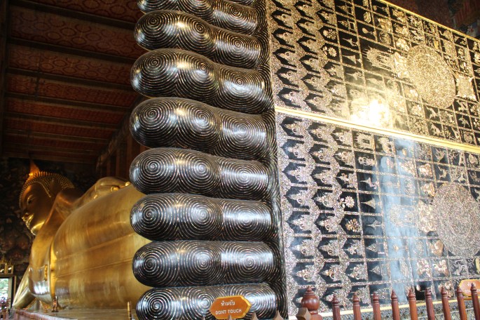 Se encuentra muy cerquita del Palacio Real y la entrada cuesta 300THB (8euros aprox.). Este templo es muy bonito. Su atractivo por excelencia es el Buda reclinado que es extremadamente grande, con 46 mt. de largo y 15 mt. de altura. A mí lo que más me gustó de este buda fueron sus pies, donde puedes encontrar incrustaciones de nácar que representan 108 signos de buen augurio.