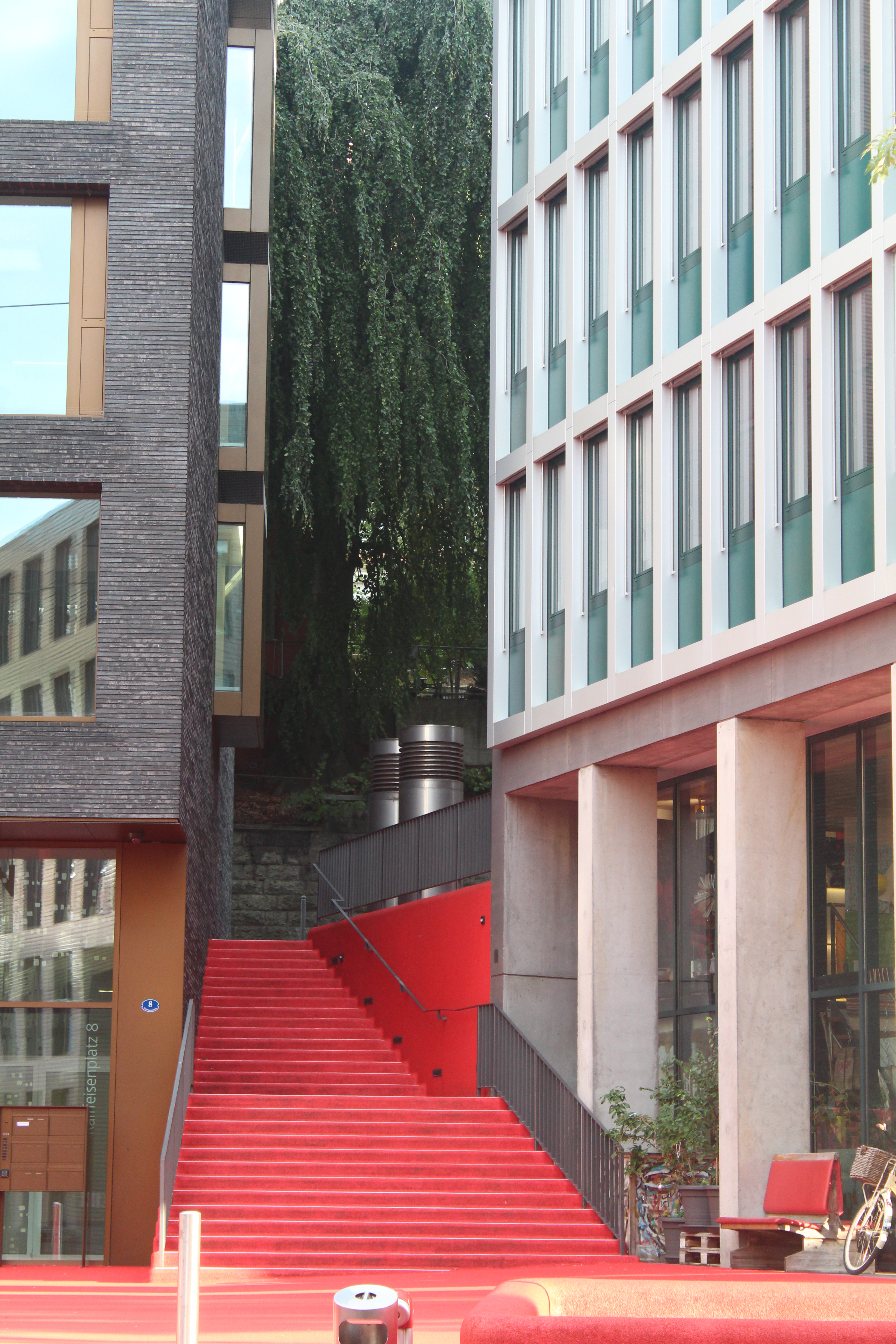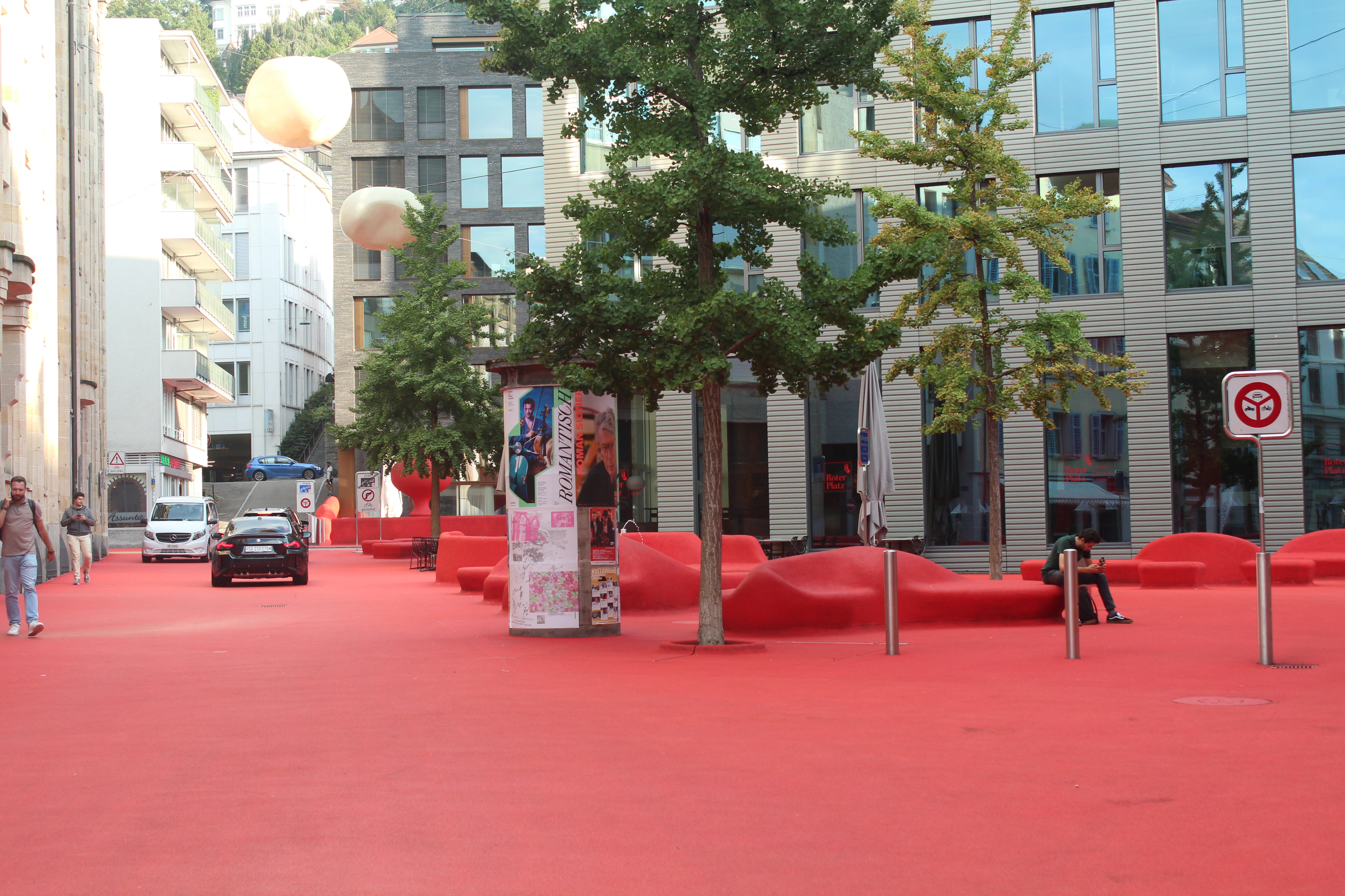 - PLAZA ROJA, está en el barrio de Bleichi y es como una auténtica sala de estar. Verás lámparas de diseño, sofás, mesas y tumbonas para relajarse, todo recubierto en granulado de goma rojo. Este barrio ha sido característico por sus comercios y zona de oficinas pero desde que Pipilotti Rist diseñó esta plaza también es un espacio de diversión durante el día para los niños y una zona para disfrute de los jóvenes en la noche.