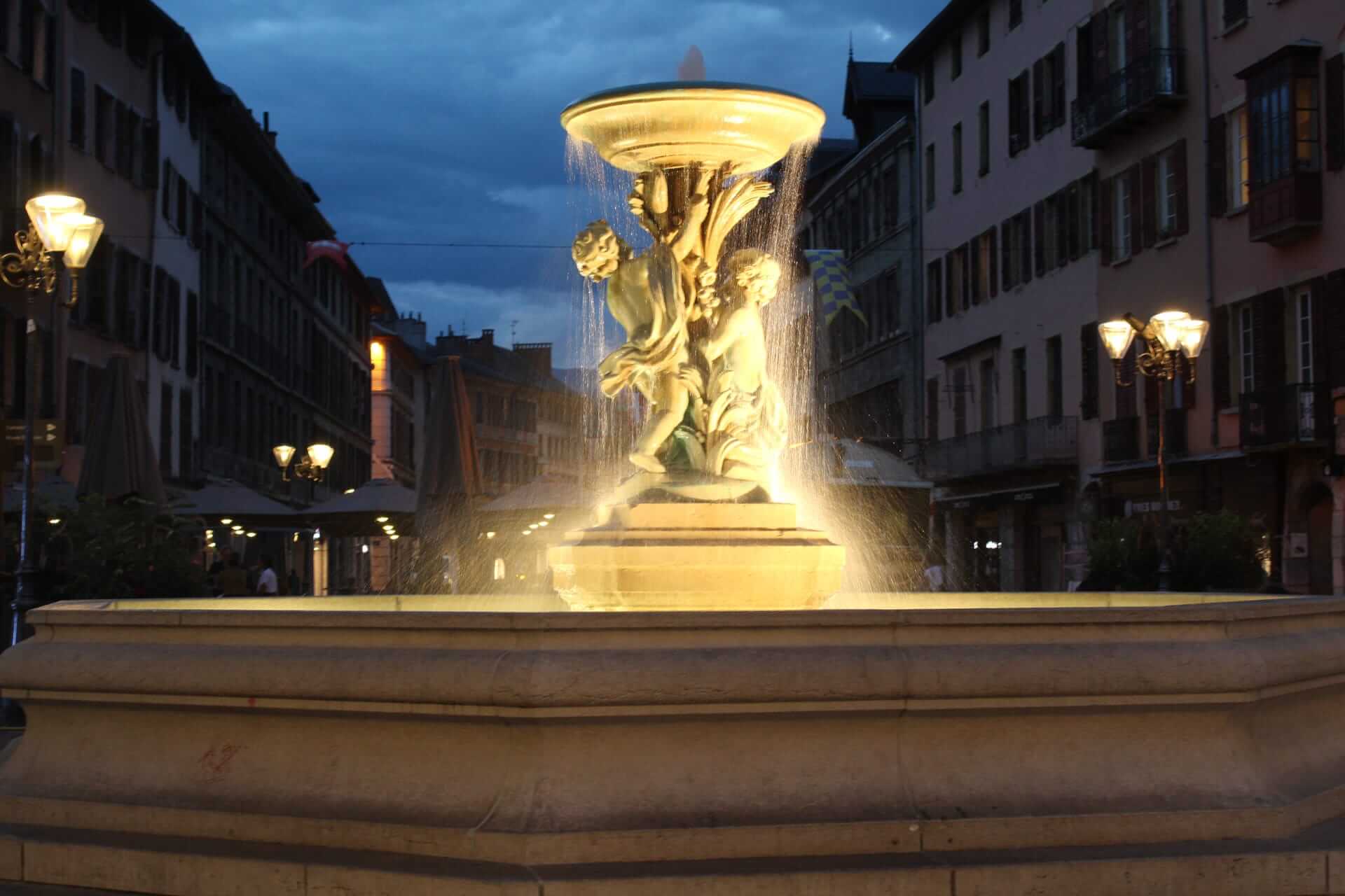 - FUENTE DE LOS ELEFANTES, La Fuente de los Elefantes es uno de los símbolos de Chambery. Se realizó en honor a el general Boigne y antiguamente llevaba su nombre como «columna de Boigne». Son 4 elefantes los que rodean la fuente, cada uno dirige su trompa hacia un punto cardinal diferente y foman la cruz de Saboya. Los habitantes de la ciudad la conocen como «La Fontaine des quatre sans cul». En 2015 tuvo una completa renovación y así como en mi foto, es como luce ahora.
