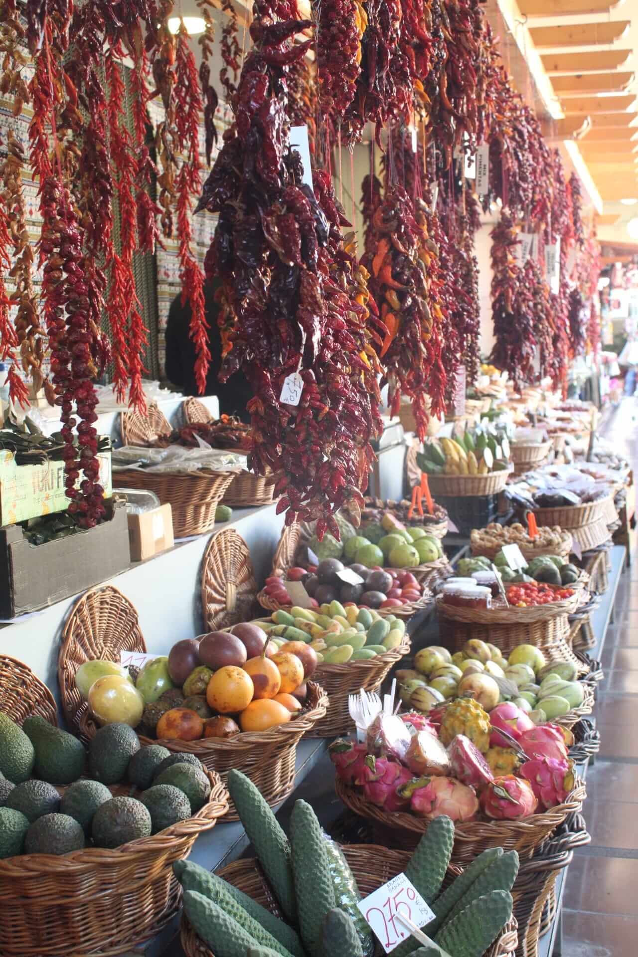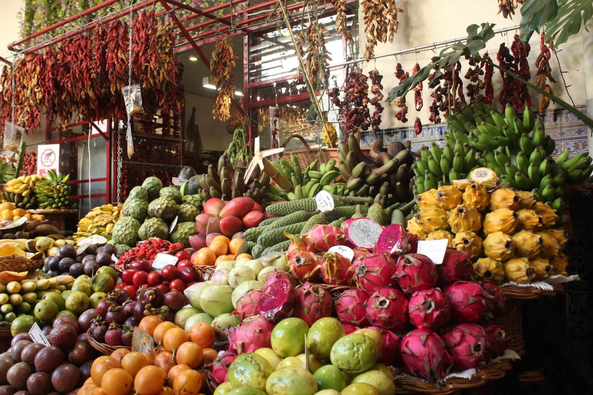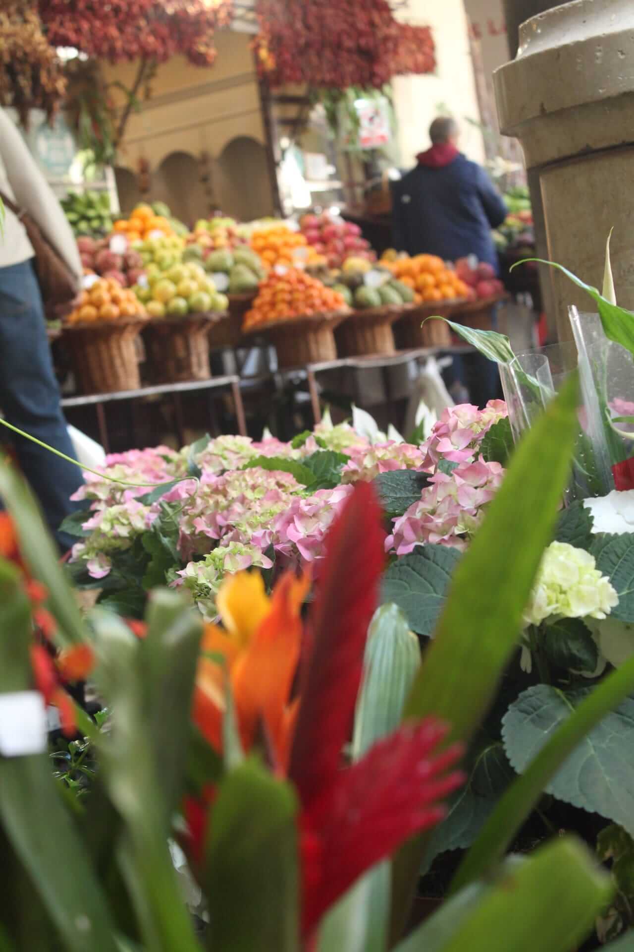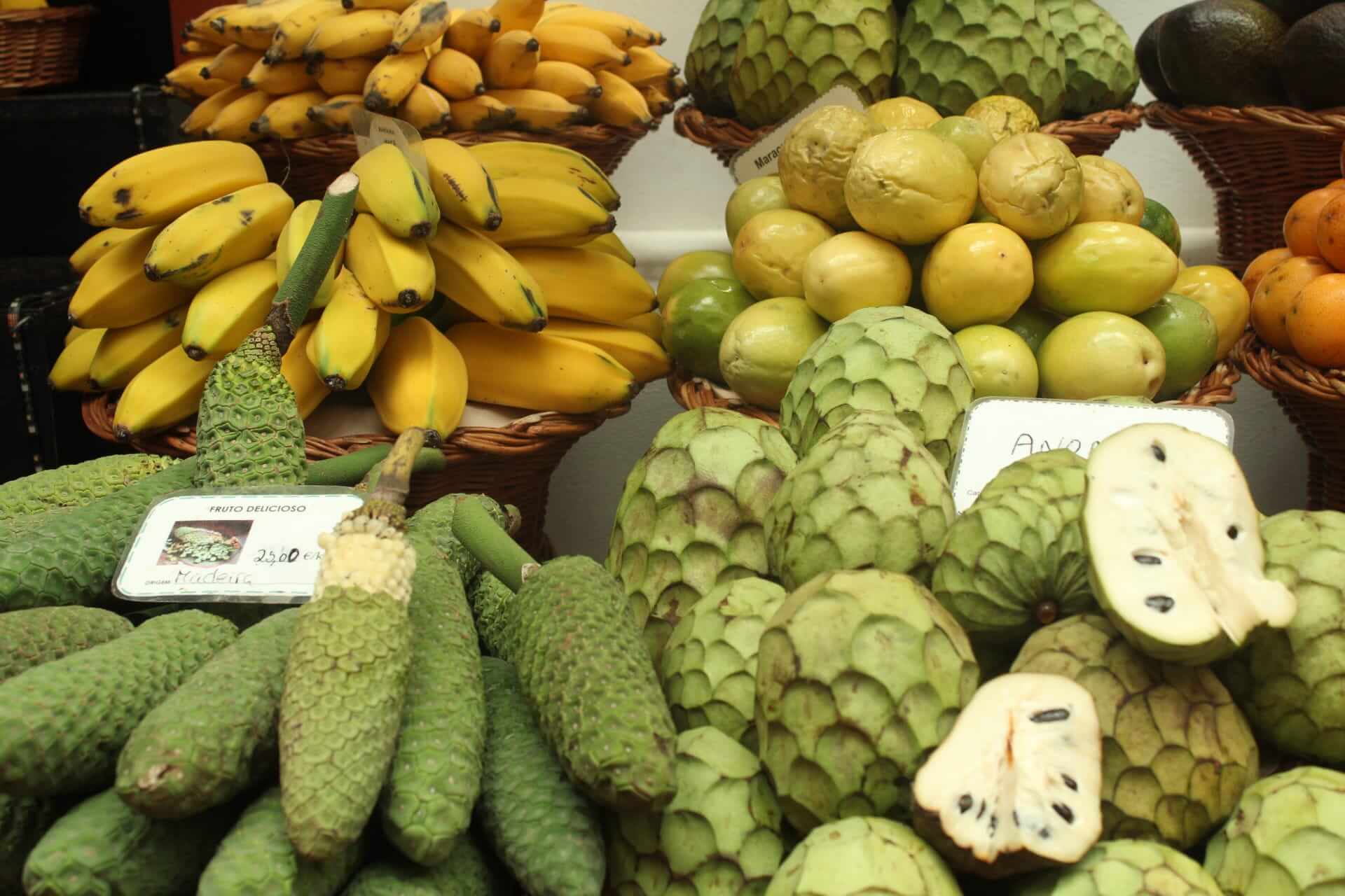 - MERCADO DOS LAVRADORES, es el mercado central donde encontrar fruta, verdura, especies, pescado, y todo tipo de productos locales. También hay una zona para las flores que destaca por las mujeres que llevan el traje típico de Madeira. Apenas entras, el colorido y la manera de presentar la fruta invita a comprar. Si das un paseo por dentro del mercado, tanto la zona baja como en la primera planta, vas a tener la posibilidad de probar frutas, sin compromiso de compra. Los vendedores suelen ofrecer «anona», «fruto delicioso» y «pitaya». La anona la ofrecen por sus propiedades anticancerígenas, el fruto delicioso es un antioxidante y la pitaya favorece el sistema sanguíneo en la producción de glóbulos rojos y blancos. Ellos afirman que esta combinación es perfecta para mantenerte sano. Los precios en el mercado son más elevados que en cualquier frutería fuera.