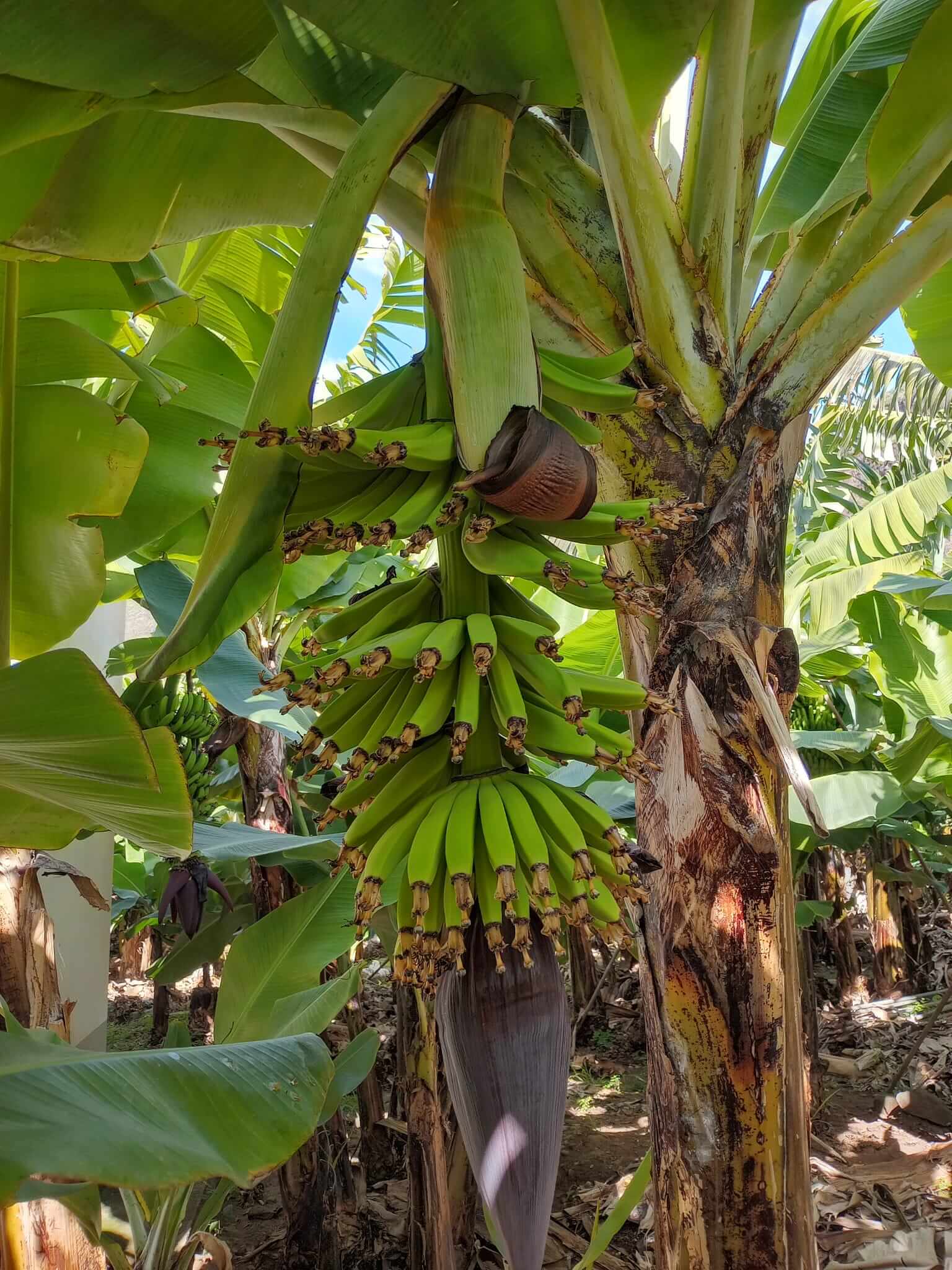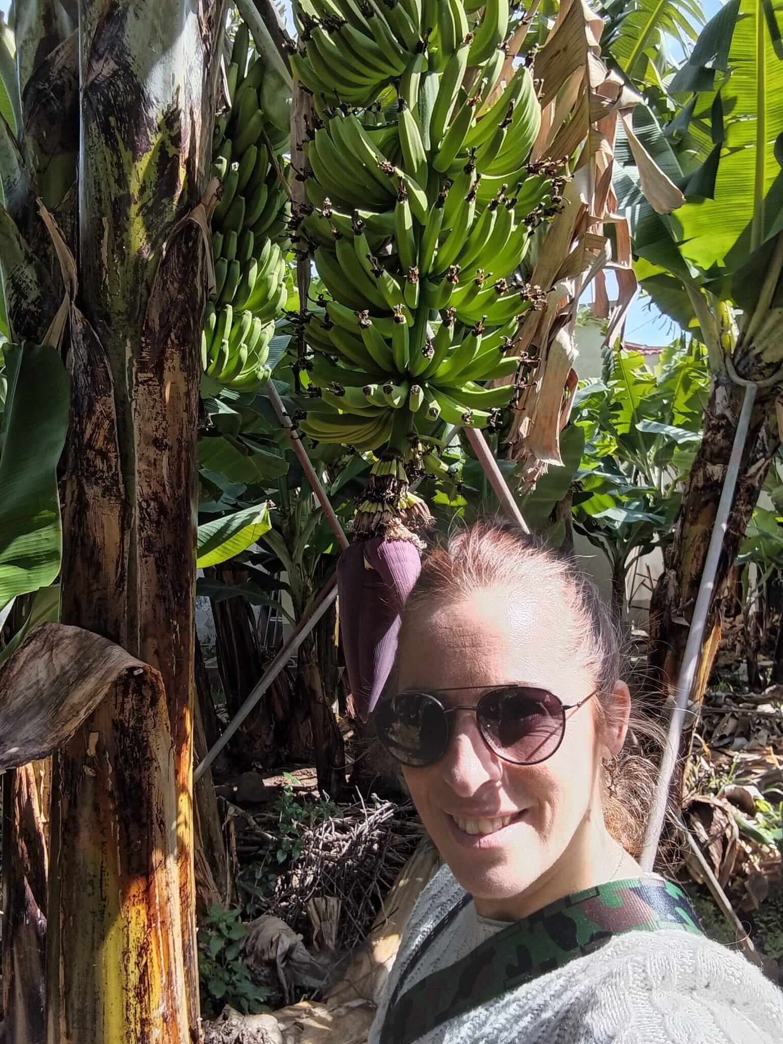 MADALENA DO MAR, plantaciones de banano. Aquí puedes adentrarte en las plantaciones de banano y puedes conocer las diferentes etapas del crecimiento de esta planta. Es bien interesante. Encontrarás los plátanos pequeñitos que aún miran hacia abajo y también verás enormes piñas de banano. El 85% de la producción va hacia Portugal y el 15% se queda en la isla de Madeira para el consumo local.