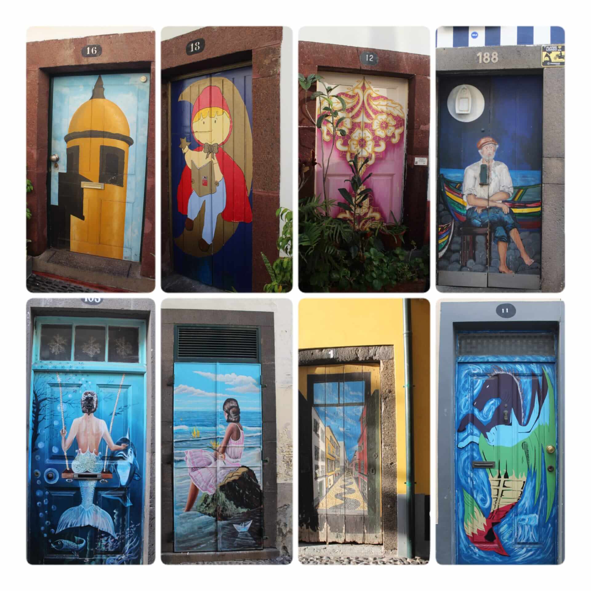 - CENTRO HISTÓRICO, «la ciudad de las puertas pintadas». Si caminas por la zona vieja de Funchal verás que las puertas están pintadas y hay algunas realmente hermosas. Este proyecto que comenzó en 2010 y el objetivo era transformar la «zona velha» (zona vieja) en una galería de arte permanente al aire libre. Arte para revalorizar una zona que estuvo abandonada, para dinamizar una de las áreas más emblemáticas de la ciudad. De esta forma se comenzó a pintar puertas de casas, locales y tiendas de la calle Santa María y hoy en día forman parte del atractivo turístico de la ciudad. Varios artistas fueron los que se unieron a esta iniciativa y ya son más de 300 puertas pintadas en 7 calles diferentes del barrio.