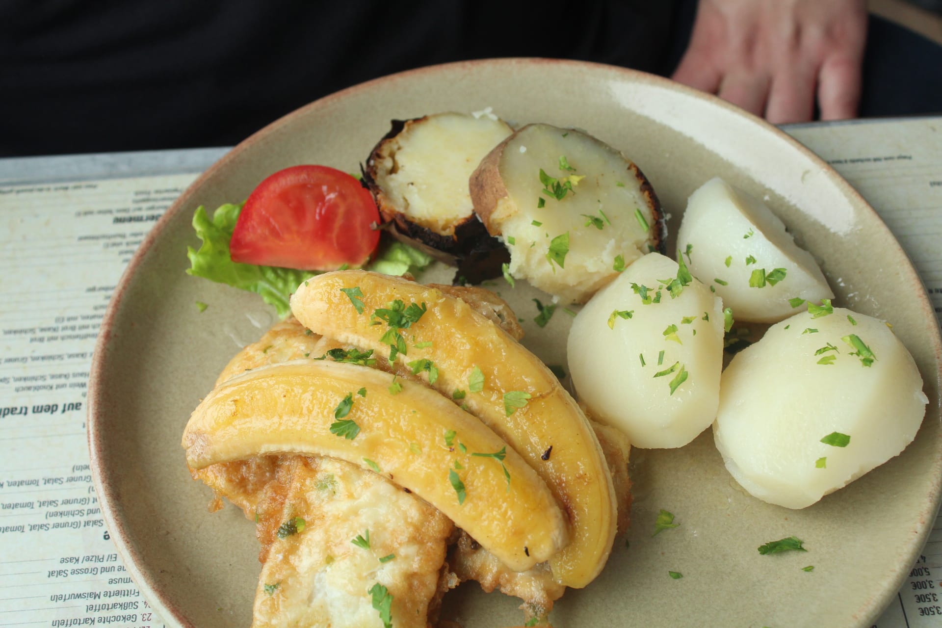 PEZ ESPADA CON BANANO, pez espada y una banana madeirense, al horno, suelen servirlo con patatas dulces y patatas saladas además de una ensalada.