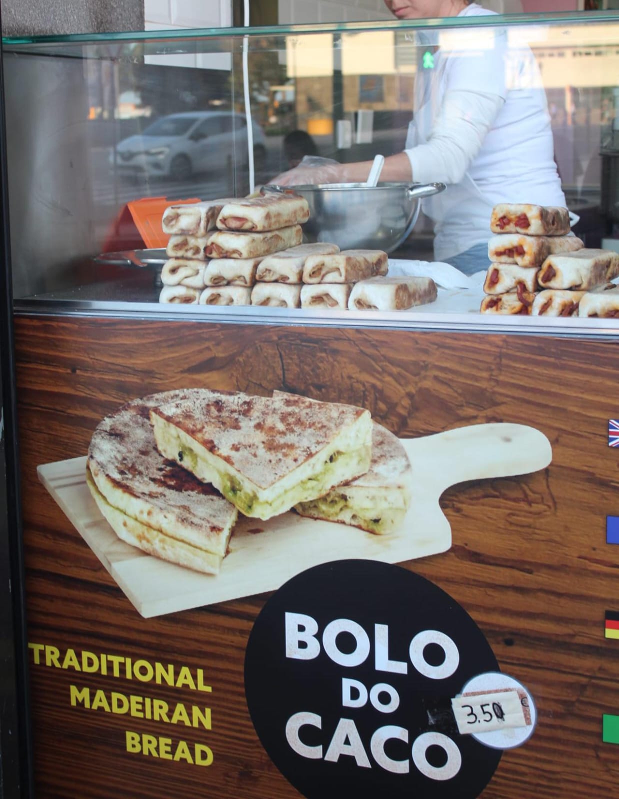 BOLO DO CACO, el tradicional es un pan horneado a leña, con manteca, aceite y ajo. Muy bueno, se come calentito como entrante o de acompañamiento para las lapas por ejemplo. También encontrarás bolo de caco rellenos (chorizo, carne, fiambre, queso). Tienes mil formas de combinarlo, está muy bueno, pero el más popular es sin relleno. Lo vas a encontrar por toda la isla.